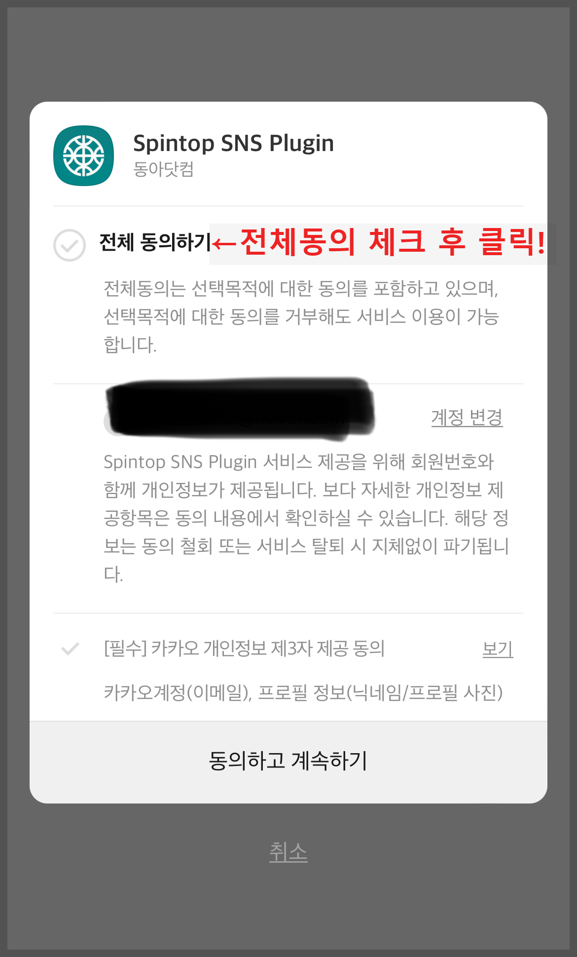 전체동의 체크를 하고 동의하고 계속하기 버튼을 누릅니다.
