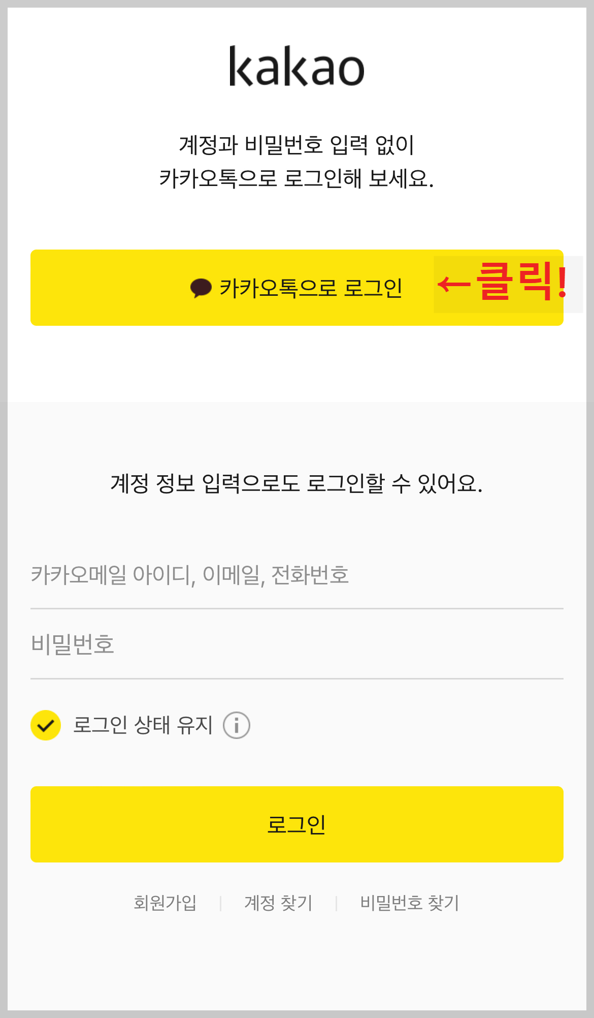 로그인은 어렵지 않습니다. 카카오톡 아이디가 있으면 바로 회원가입이 가능합니다.