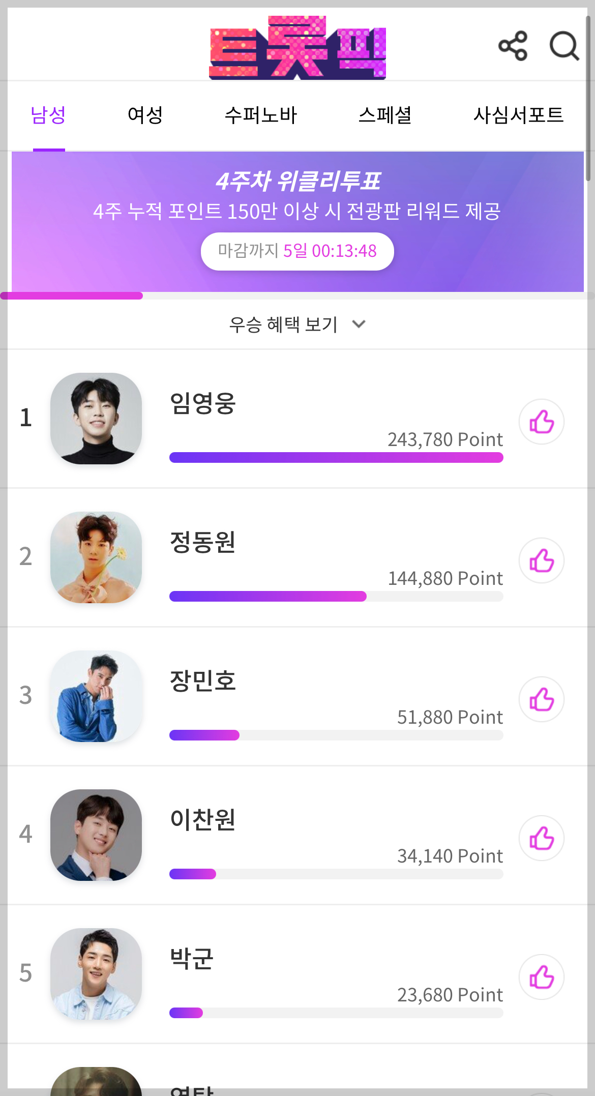 짠 로그인이 완료되었습니다. 위클리투표, 스페셜투표, 사심서포트 투표 창이 있으며 자유롭게 들어가셔서 투표를 하시면 됩니다. 먼저 위클리 투표 순위를 확인해 봤습니다.