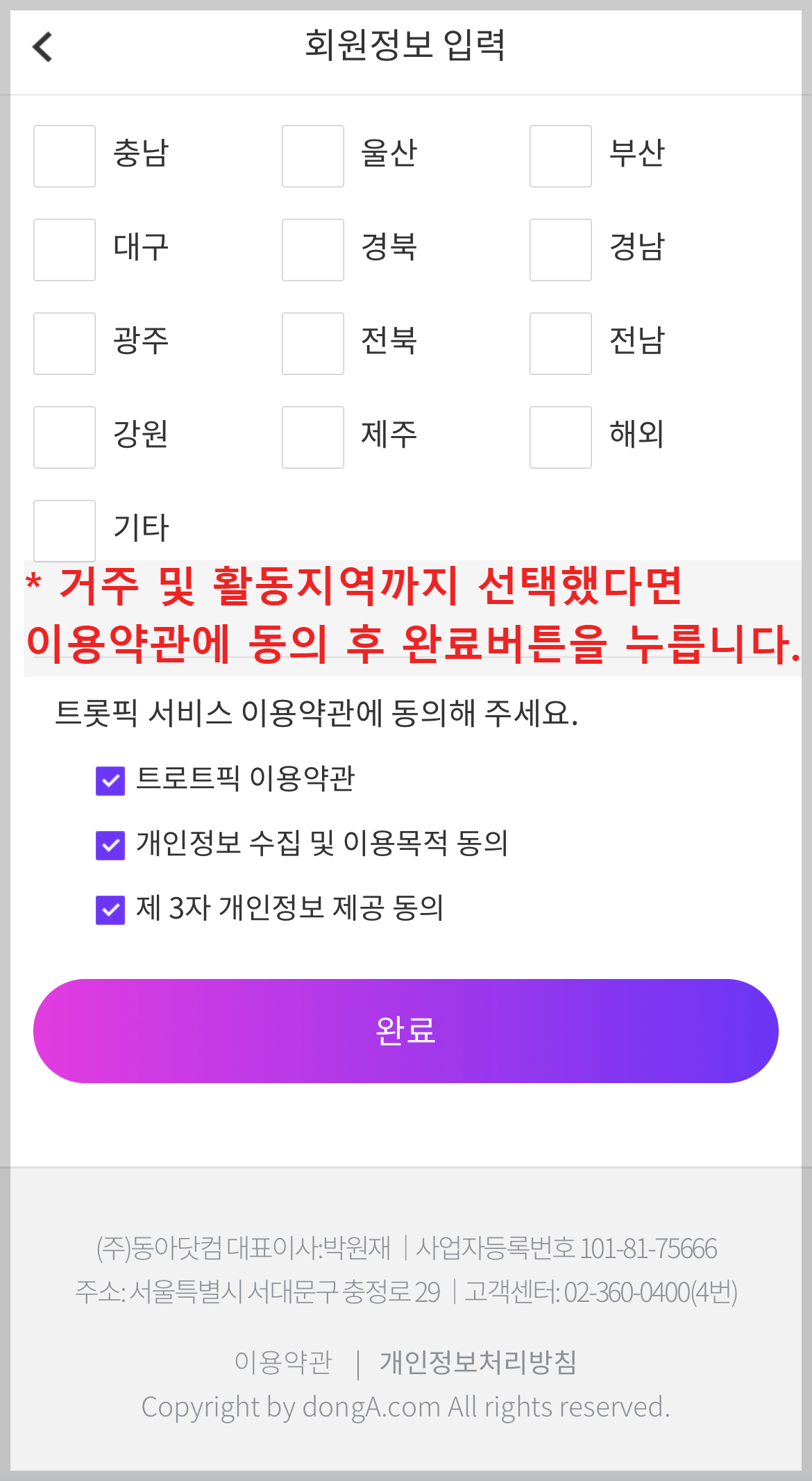 거주 및 활동지역까지 선택했다면 이용약관에 동의 후 완료버튼을 누릅니다.