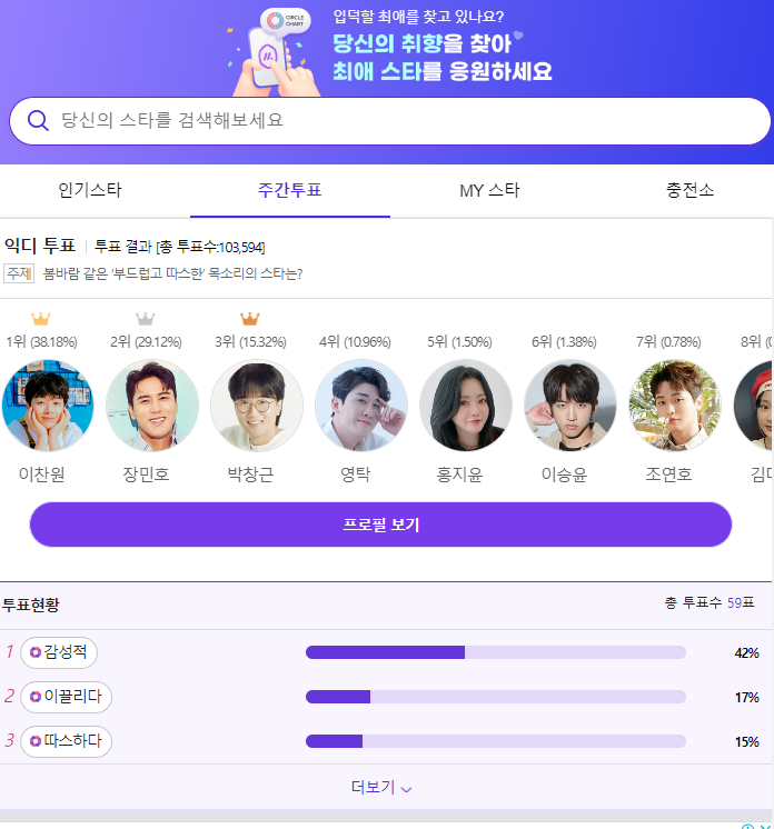 현재 마이셀럽스 스타 주간투표 주제인 '봄바람 같은 부드럽고 따스한 목소리 스타는?'이라는 주제로 이찬원이 총 투표수 39,557표로 1등을 달리고 있습니다.