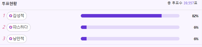 그와 가장 어울리는 말로는 감성적이 82%, 따스하다가 6%, 낭만적이 6%입니다. 역시 따스한 목소리에 어울리는 말들이네요. 투표가 2일 남은 가운데 현재 순위를 유지해야 합니다. 여러분들의 투표가 중요하겠네요!
