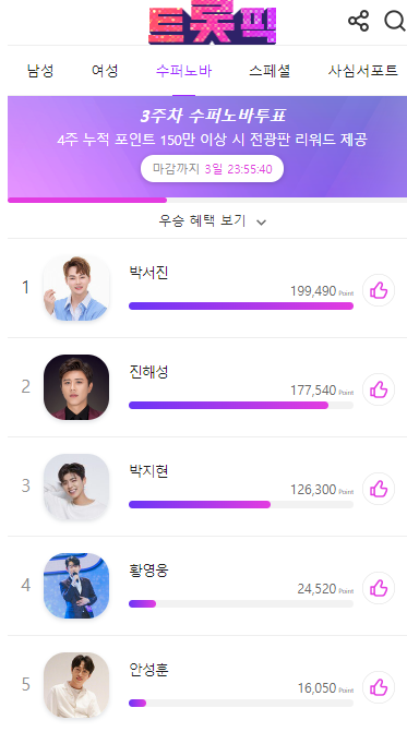 | 230423(오전) 트롯픽 3주차 슈퍼노바투표 상황(실시간) (1) | 2023.04.23 |
