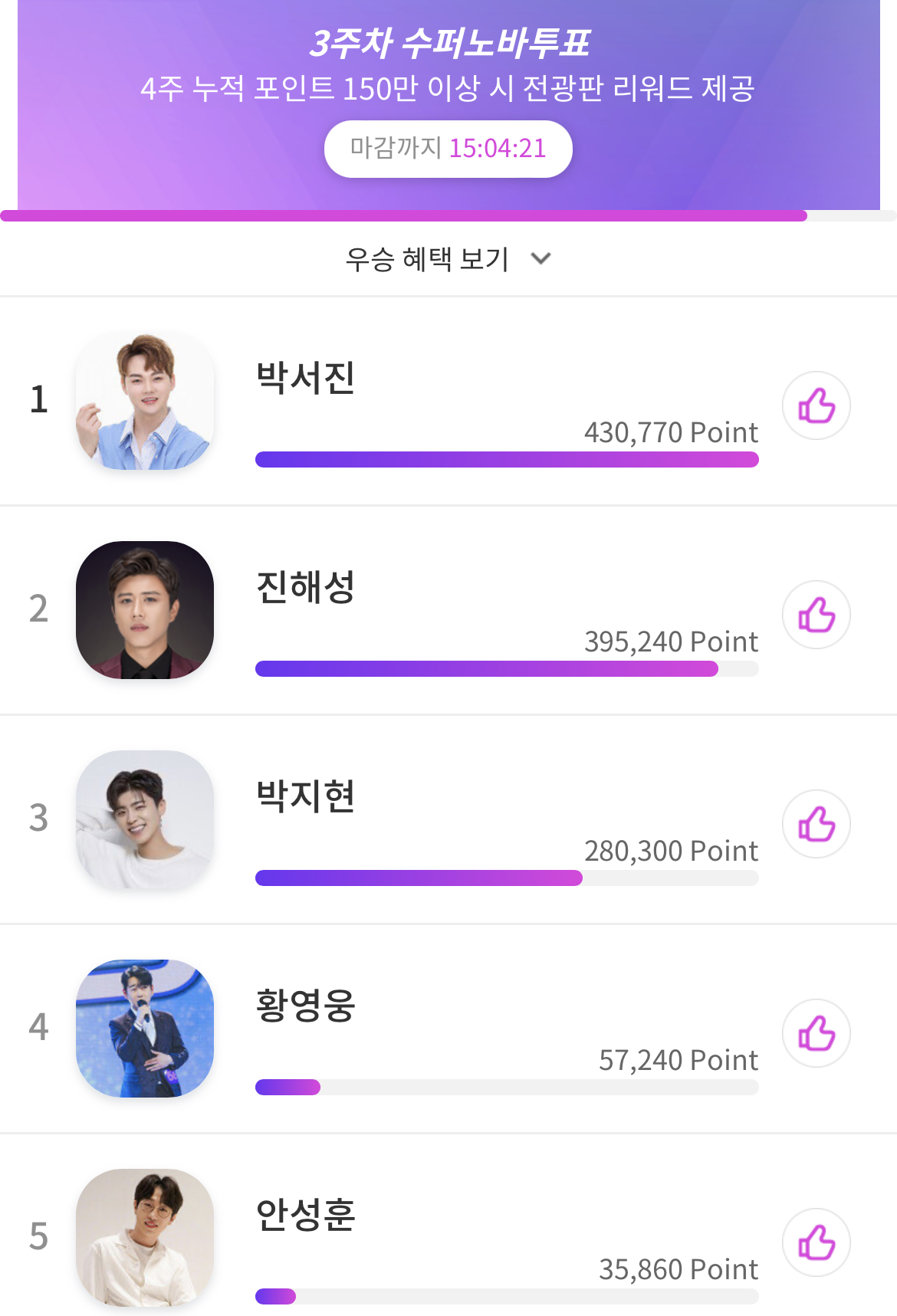 4월 3주차 슈퍼노바 현재 1위는 박서진(430,770포인트), 2위는 진해성(395,240포인트)로 1, 2위간 포인트 차이는 약 3만 5천포인트 차이 입니다. 박지현은 현재 3위로 280,300포인트를 획득하고 있습니다. 박지현은 현재 1위와 투표차이가 조금 벌어져 있는 상황입니다 하지만 팬덤이 힘을 모은다면 언제든 1, 2위가 가능할 것으로 예측됩니다.