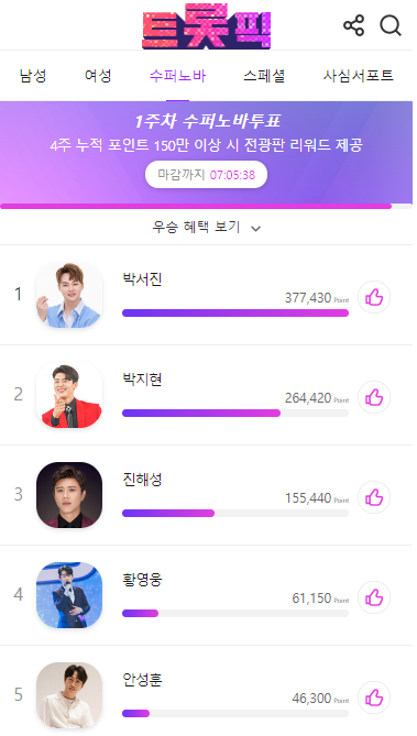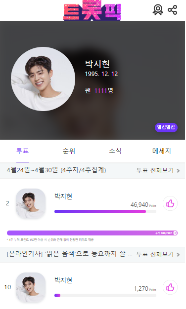 4월 4주차 슈퍼노바 현재 1위는 진해성(51,870포인트) , 2위는 박지현(46,910포인트)로 1, 2위간 포인트 차이는 약 5천포인트 차이 입니다. 투표 초반이지만 저번 투표에서 3위를 차지했던 박지현은 현재 2위를 형성하고 있습니다. 팬덤이 힘을 모은다면 언제든 1위 또한 가능할 것으로 예측됩니다.