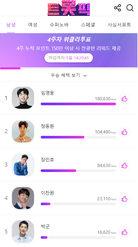 4주간 부문별 1위 한 가수에게는 '초대형 전광판 서포트'를 하고 있으며, 4주간 150만 포인트 이상 득점한 모든 가수에게는 '명동 전광판 서포트'를 합니다. 힘든 시기를 겪고 있는 정동원에게 힘이 되어주는 투표가 되었으면 합니다.