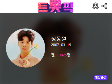 한편 정동원은 트롯픽에서 10825명의팬을 보유중이며, 트롯픽 위클리 차트 최근 7개월 동안 2위를 벗어난적이 없습니다.