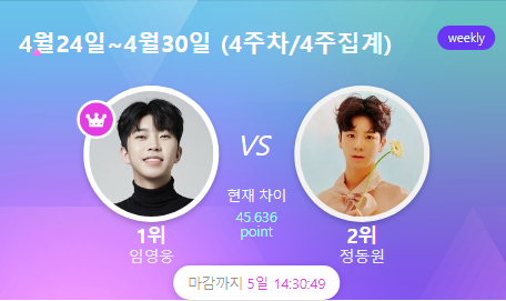 현재 1위는 임영웅 180,630포인트이며, 정동원은 2위로 104,490포인트, 3위는 장민호로 84,630포인트 입니다. 현재 1, 2위간 득표 차이는 7만6천표이며, 정동원은 꾸준히 2위자리를 지키며 좋은 투표율을 보여주고 있는 상황입니다.