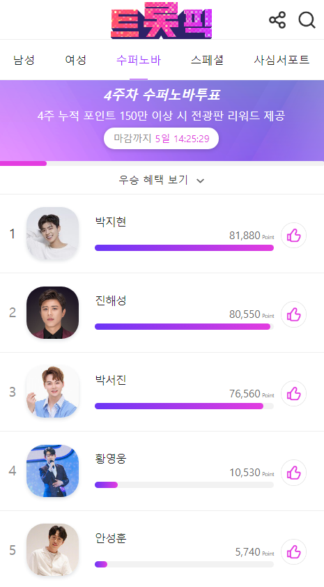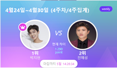 4월 4주차 슈퍼노바 현재 1위는 박지현(81,880 포인트), 2위는 진해성(80,550 포인트)로 1, 2위간 포인트 차이는 약 1천 포인트 차이 입니다. 투표 초반이지만 저번 투표에서 3위를 차지했던 박지현은 현재 1위를 형성하고 있습니다. 투표 총공으로 박지현이 이번 4주차 1위를 하기를 기원합니다.