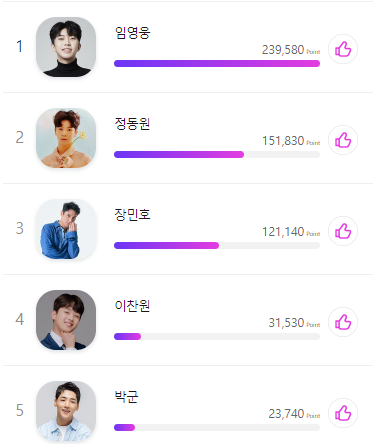 현재 1위는 임영웅 239,580포인트이며, 정동원은 2위로 151,830포인트, 3위는 장민호로 121,140포인트 입니다. 현재 1, 2득표차이는 약 8만7천표 차이입니다. 정동원은 꾸준히 2위자리를 지키며 좋은 투표율을 보여주고 있는 상황입니다. 우주총동원의 총공격이 매서운 상황입니다.