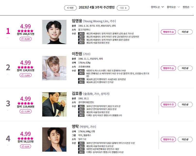 평점랭킹 '평점랭킹'은 팬들이 만드는 차트로 국내가수의 객관적인 수치를 구하기 힘든 팬덤 회원들의 성향과 규모 및 충성도 등을 측정하는 지표입니다. 중요) 먼저 평저랭킹 투표를 위해서는