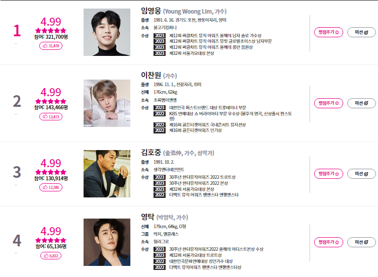 2위 이찬원과 3위 김호중간의 순위싸움이 갈수록 치열해지고 있는 상황입니다. 각 팬덤의 적극성에 따라 순위가 변동 될 가능성도 보입니다.