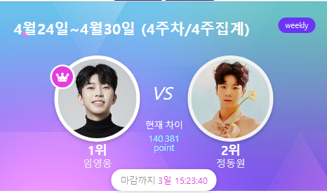 현재 1위는 임영웅446,920포인트이며, 정동원은 2위로 273,020포인트, 3위는 장민호로 235,210포인트 입니다. 현재 1, 2위간 득표 차이가 어느정도 나는 편이지만, 정동원은 꾸준히 2위자리를 지키며 좋은 투표율을 보여주고 있는 상황입니다.