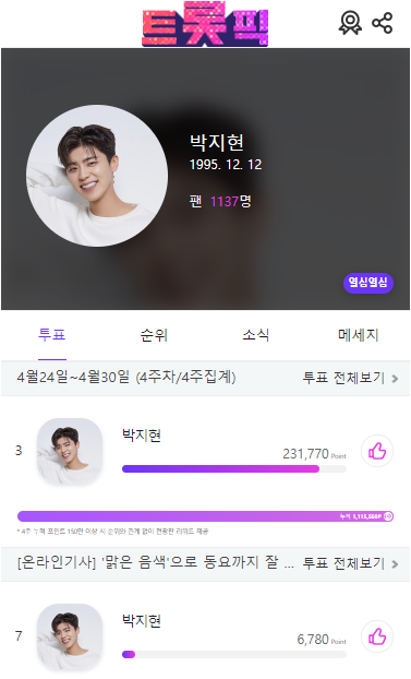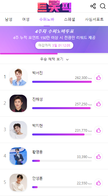 4월 3주차 슈퍼노바 현재 1위는 박서진(262,300포인트), 2위는 진해성(257,250포인트)로 1, 2위간 포인트 차이는 약 11만포인트 차이 입니다. 박지현은 현재 3위로 231,770포인트를 획득하고 있습니다. 현재 1위와 투표차이가 조금 벌어져 있는 상황이지만, 팬덤이 힘을 모은다면 언제든 1, 2위가 가능할 것으로 예측됩니다.
