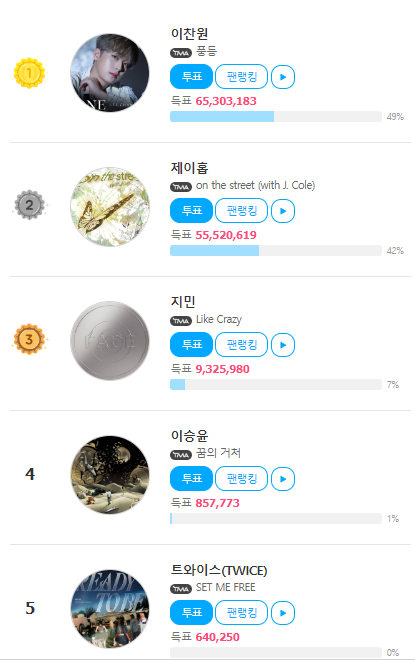 현재 1위는 이찬원으로 65,303,183 표, 2위는 제이홉으로 55,520,619표로 1,2위간 투표차이는 약 약980만표 차이입니다. 이찬원은 결선 투표에서 아주 좋은 모습을 보여주며 1등을 질주하고 있습니다. 찬스의 결선투표 총공세 작전이 빛을 보고있는 상황입니다.