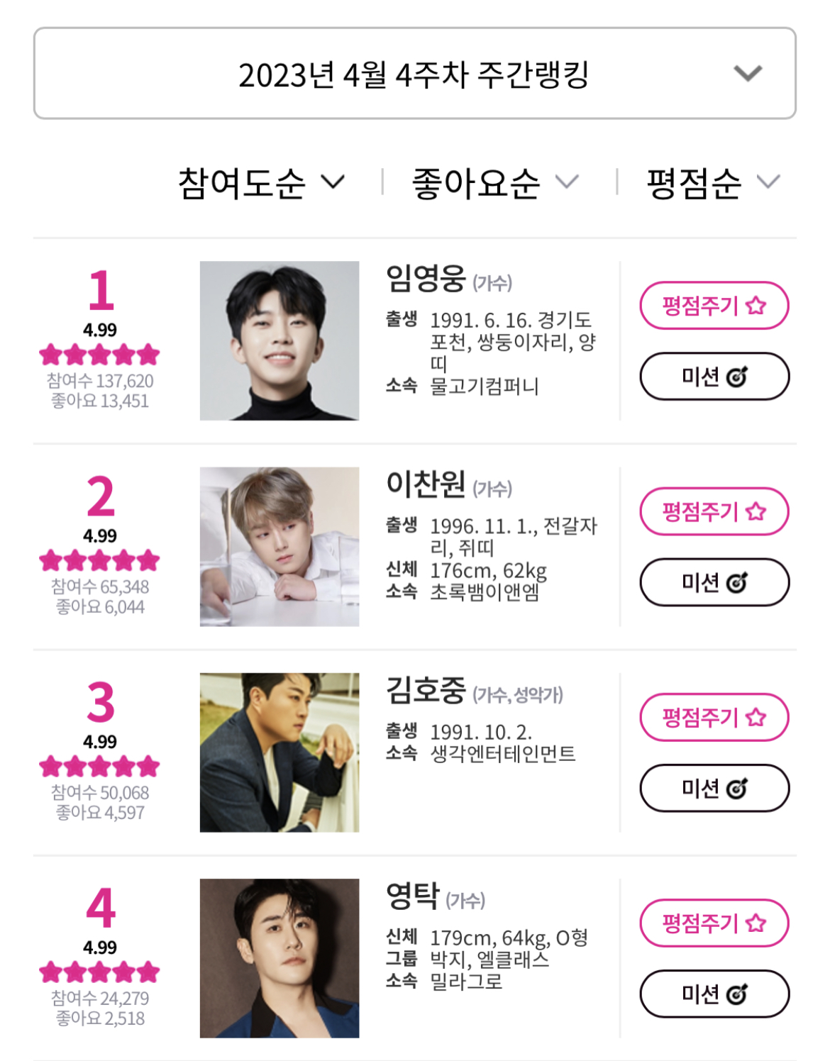 평점랭킹 '평점랭킹'은 팬들이 만드는 차트로 국내가수의 객관적인 수치를 구하기 힘든 팬덤 회원들의 성향과 규모 및 충성도 등을 측정하는 지표입니다. 중요) 먼저 평저랭킹 투표를 위해서는